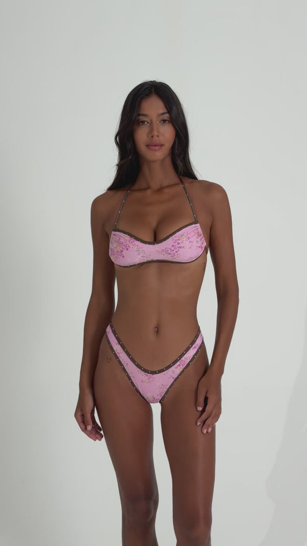 Italian-made nylon with gold embossed polka dot detail, digitally printed with a dainty pink floral. Soft, lightweight, and sustainable.